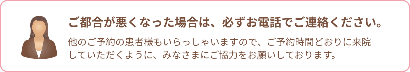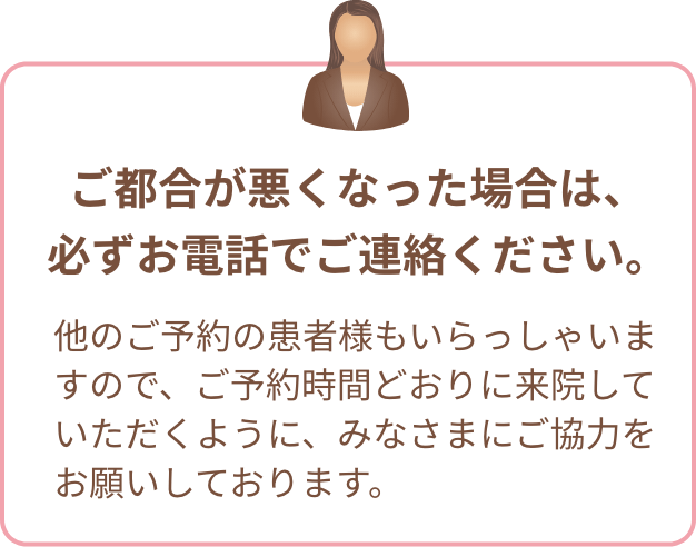 当院では時間予約制を採用していますが、治療の内容によってはお待たせしたり、順番が前後する場合がございます。また、急患は随時受け付けておりますが、予約の患者様が優先となりますので、待ち時間に関しましてはお約束することができません。