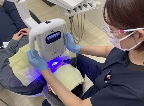 ホワイトニングは別名「ブリーチング」とも呼ばれ、変色してしまった歯の表面にホワイトニング剤を塗布して歯に着色した色素だけを分解し、歯そのものを漂白します。大切な歯を削ったり被せものをして歯を「白く見せる」のではなく「歯そのものを白くする」のがホワイトニング。タバコのヤニ、コーヒー、紅茶等の茶しぶは、一度着色したらハミガキではなかなか取れません。当院では、ホワイトニング専用のお部屋をご用意して、特殊ライトを照射し短時間で歯を白くさせます。よりリラックスした雰囲気の中、美容院やジムに通う感覚でホワイトニングを行っていただけます。